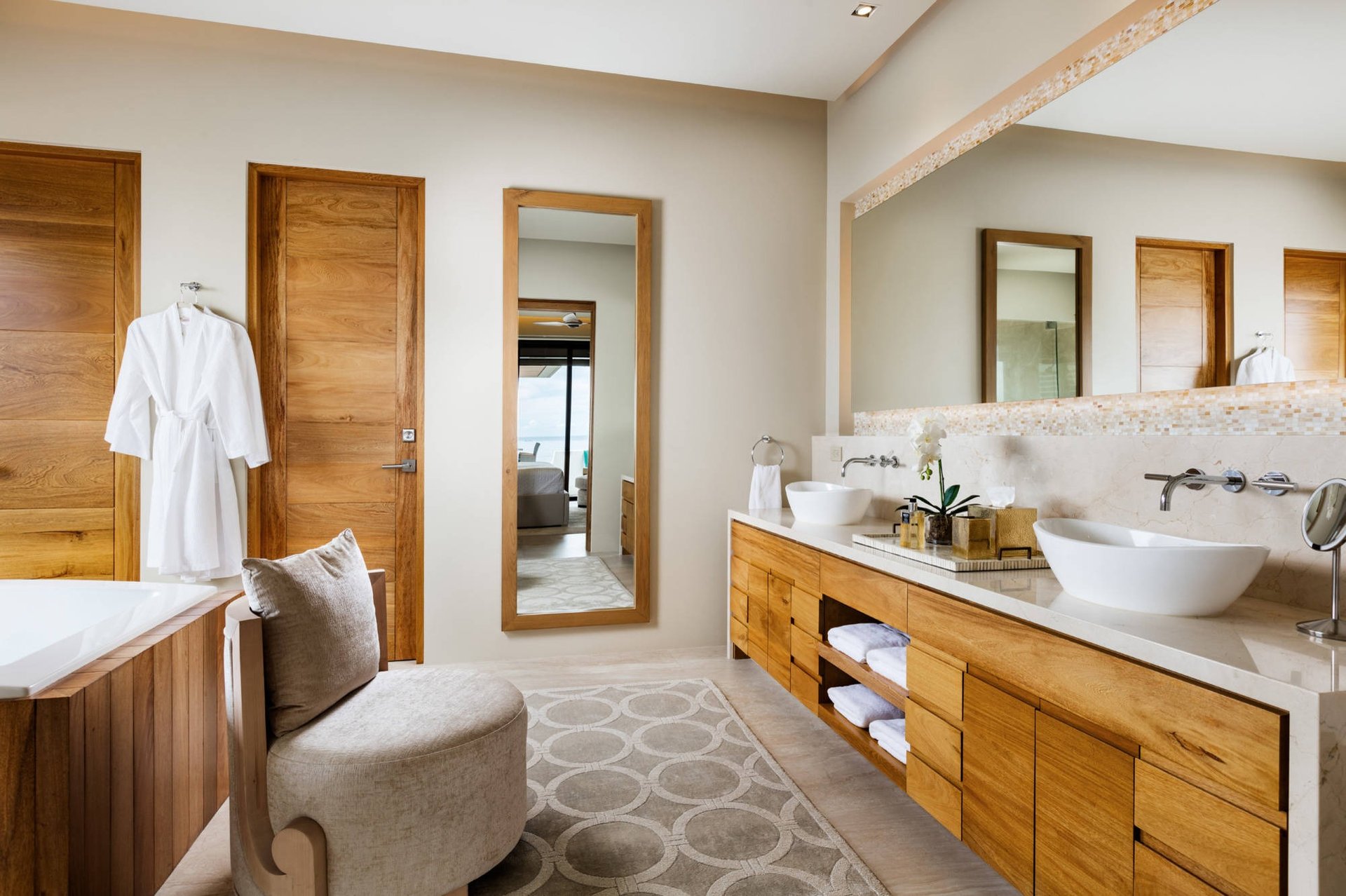 If you’re undertaking a renovation, consider upgrading fixtures and materials. Handmade tile and custom cabinetry can add a touch of style and luxury. Trade stark whites for warm neutrals to create a more relaxed feel—think light wood tones, creams, and beiges.3 Complete the look with soft ambient lighting from a backlit mirror or pair of decorative sconces.2,3